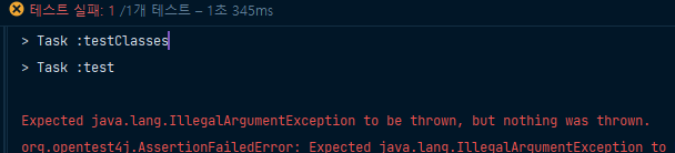 조금 불편하거나 이해가 안 될 수도 있었지만 어쨌든 "예외를 반환해야 한다" 는 케이스에 대해 검증하고 어플리케이션 코드까지 잘 개발해 냈습니다. 명확한 요구사항이 있었기 때문에 명확한 테스트를 먼저 작성할 수 있었고, 테스트를 통과한다는 목적을 가지고 명료하게 기능을 개발할 수 있었습니다. 이렇게 테스트는, 개발할 기능에 대한 설계도이자 요구사항 명세로서의 기능도 가지고 있습니다.