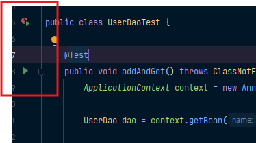 메서드 옆의 실행 버튼을 누르면 해당 테스트 메서드만 실행됩니다. 클래스의 실행 버튼을 누르면 해당 클래스 내의 모든 테스트 메서드들이 실행됩니다.