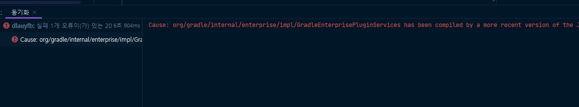 원인: org/gradle/internal/Enterprise/impl/GradleEnterprisePluginServices는 최신 버전의 Java Runtime(클래스 파일 버전 61.0)에 의해 컴파일되었으며, 이 버전의 Java Runtime은 클래스 파일 버전을 최대 55.0까지만 인식합니다